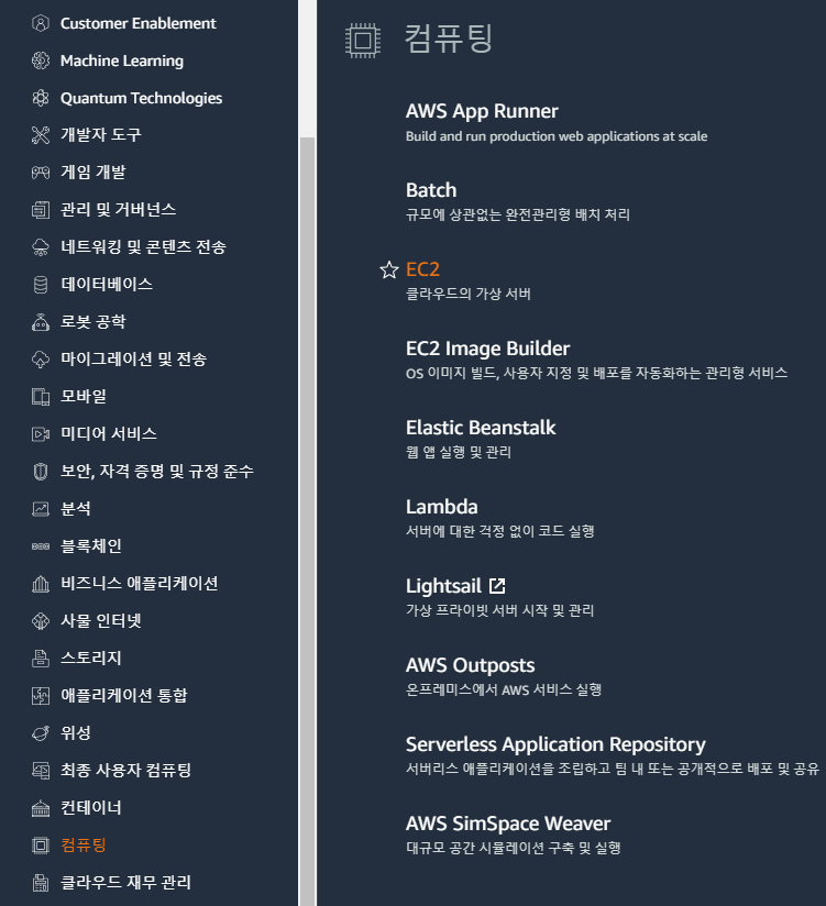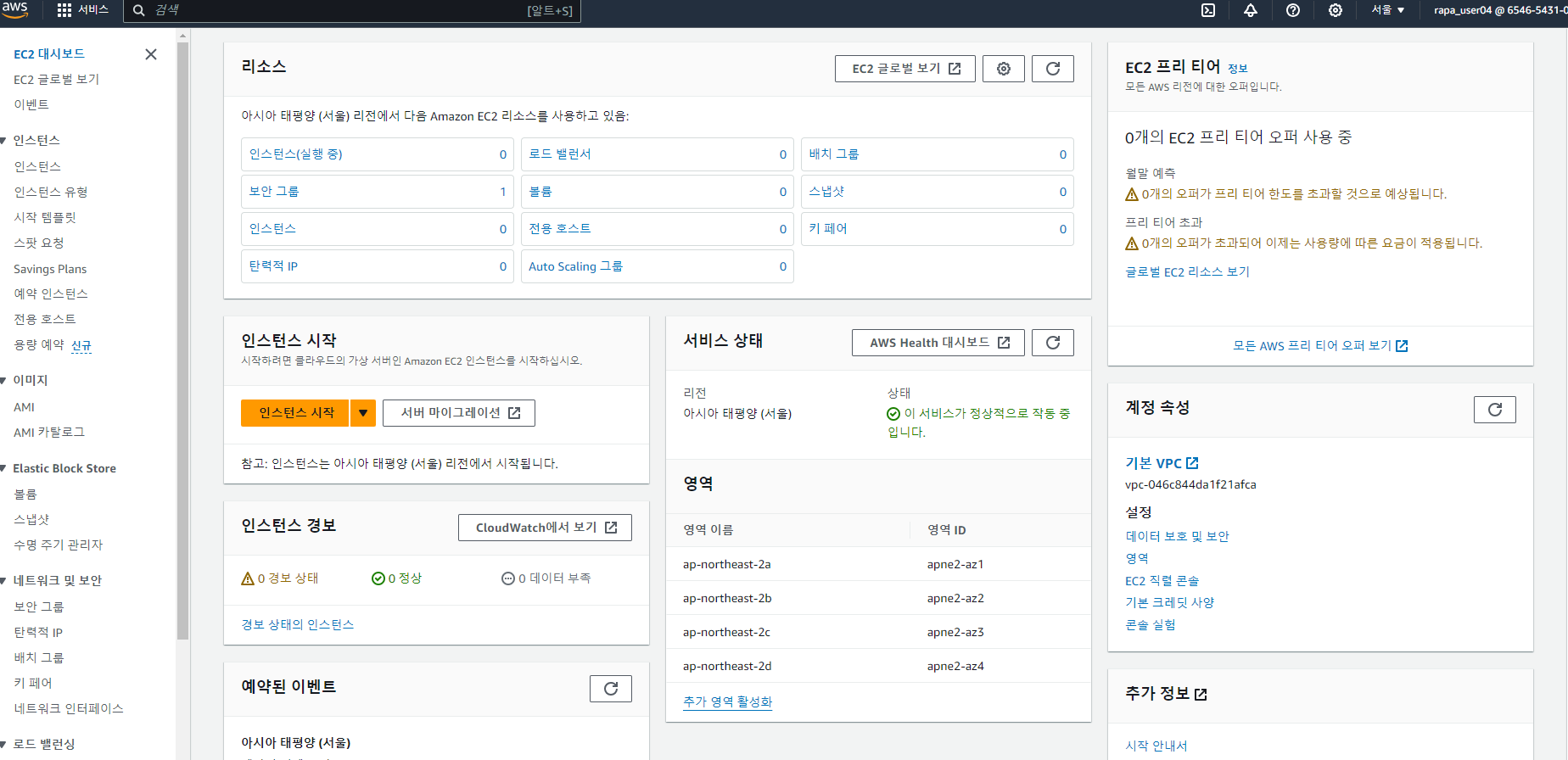 EC2 클릭하면 EC2에 대한 대시보드 화면으로 넘어감