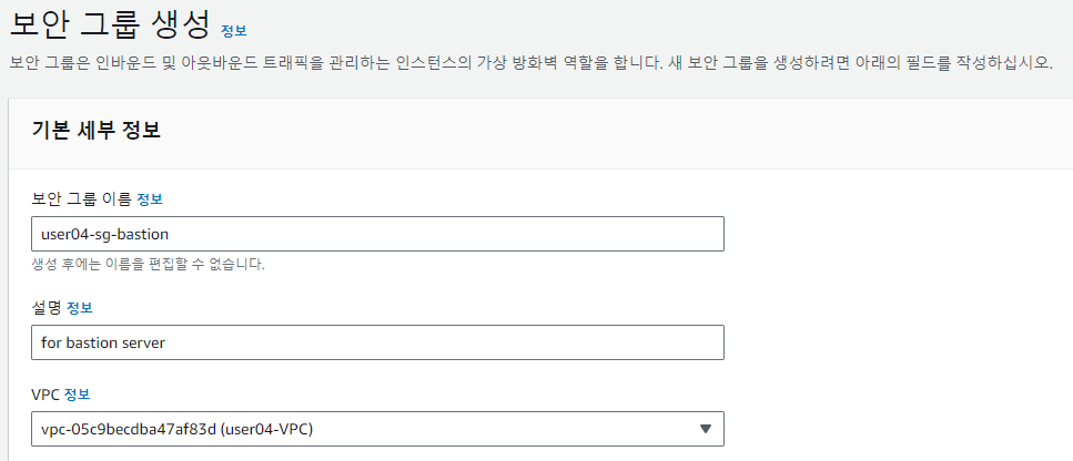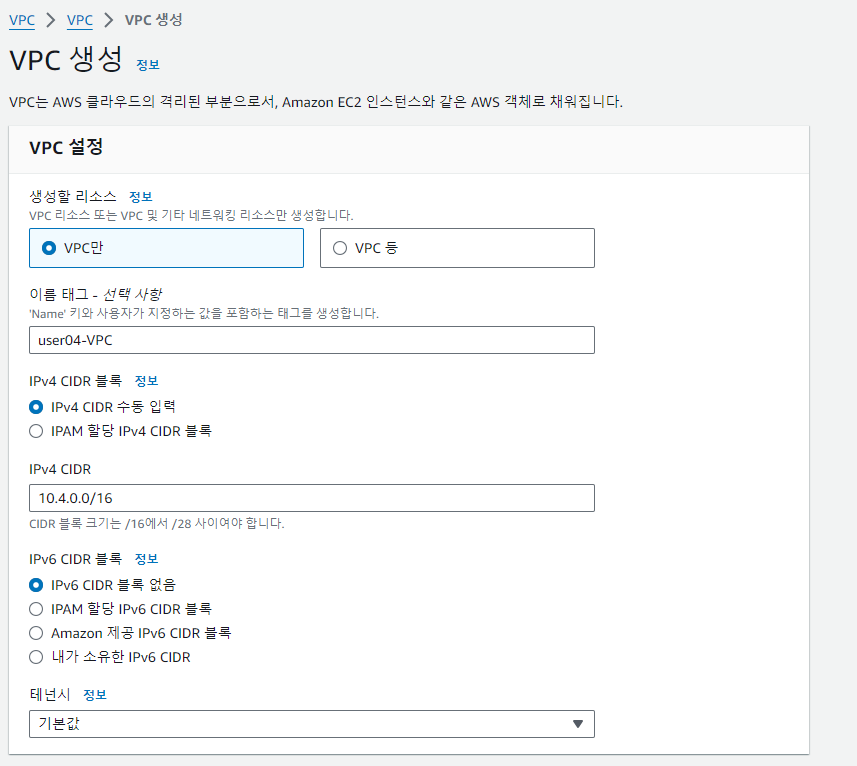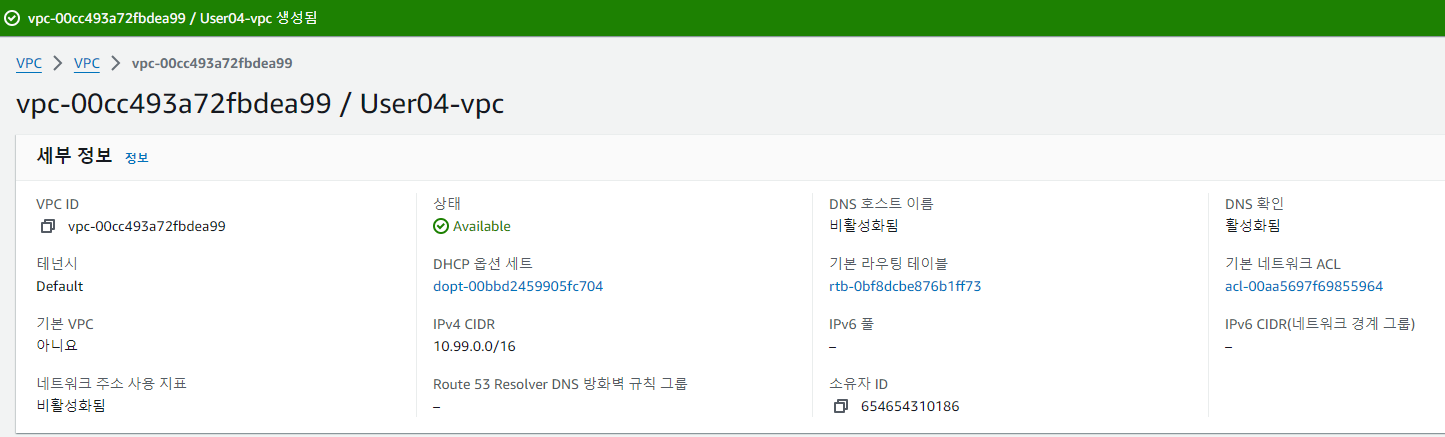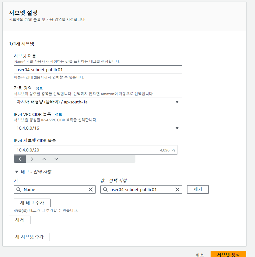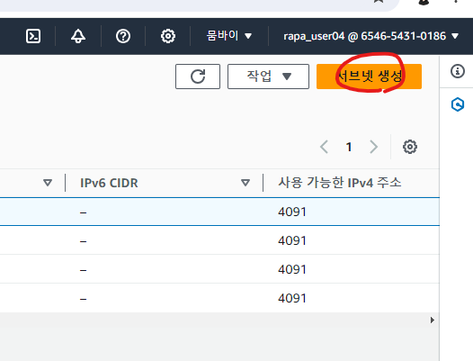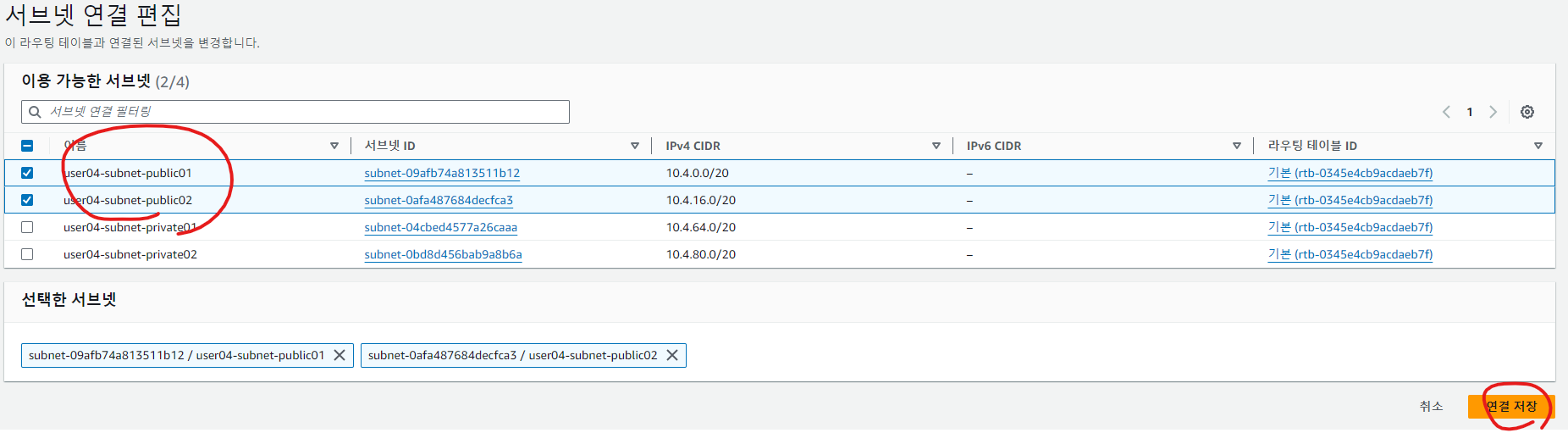 user04-subnet-public01 서브넷 CIDR 블록 10.4.0.0/20 가용영역 a