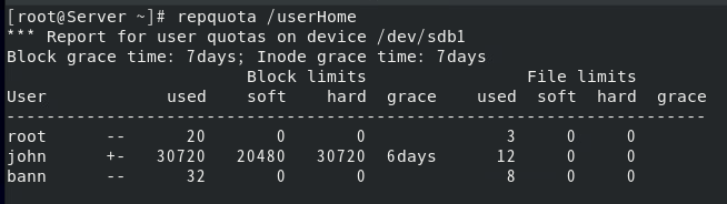 루트로 돌아와서 repquota /userHome을 입력하여 사용자 별 현재 사용량을 확인 할 수 있습니다.