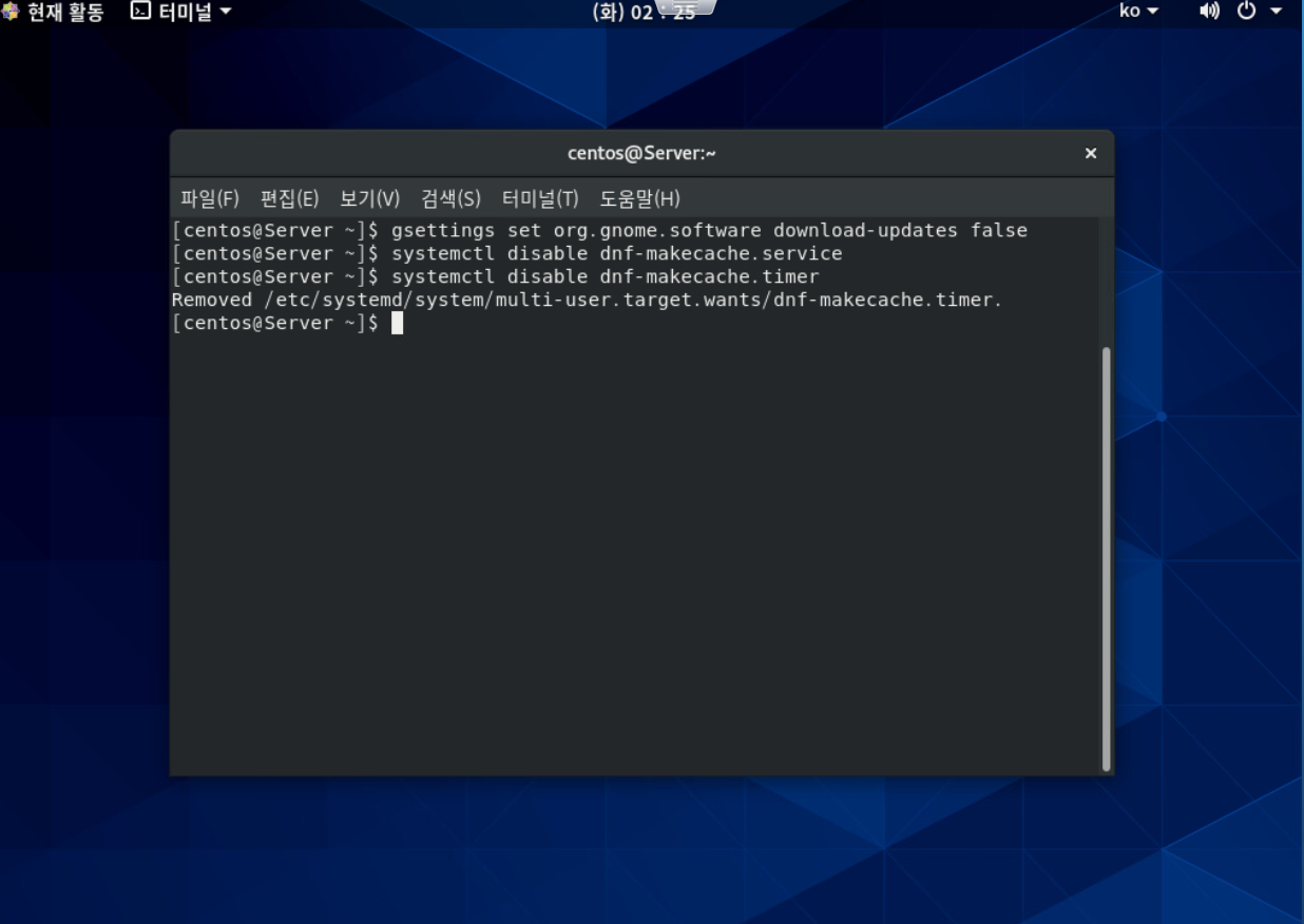 CentOS는 백그라운드로 새로운 패키지를 자동 업데이트하도록 설정되어있기 때문에 자동 업데이트 끄기.