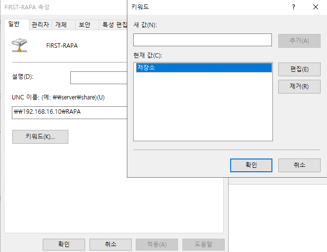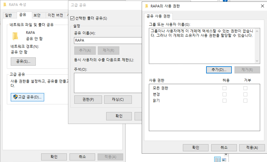 아까 만든 FIRST의 폴더 속성 - 고급 공유 - 선택한 폴더 공유 체크 - 권한 - Everyone 제거하고 추가 - rapacompany 추가 - 모든권한 체크 - 적용 및 확인