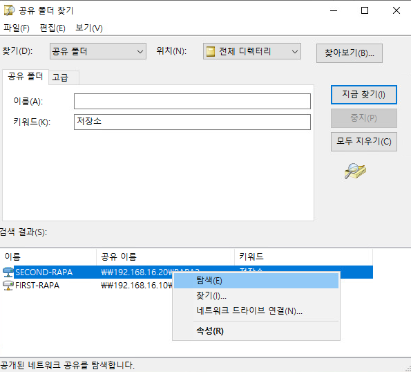 찾기 : 공유 폴더 - 키워드 : 저장소 - 지금 찾기 - 탐색