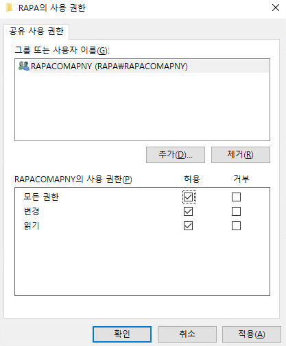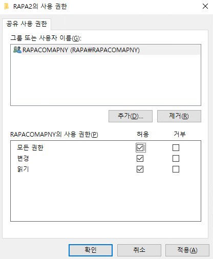 아까 만든 FIRST의 폴더 속성 - 고급 공유 - 선택한 폴더 공유 체크 - 권한 - Everyone 제거하고 추가 - rapacompany 추가 - 모든권한 체크 - 적용 및 확인