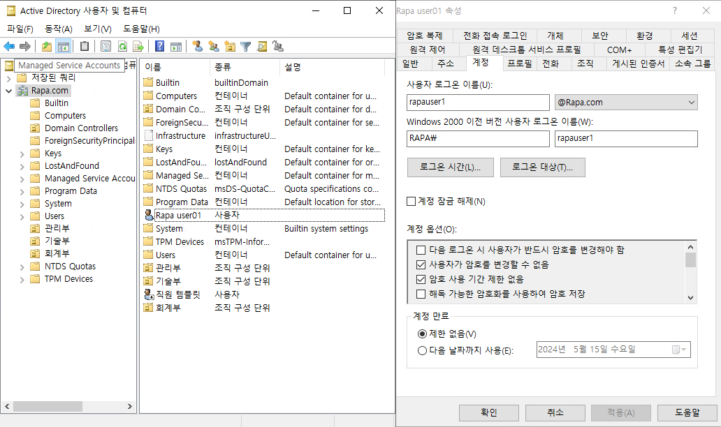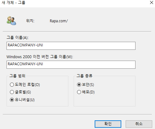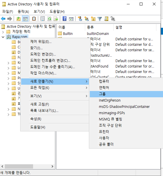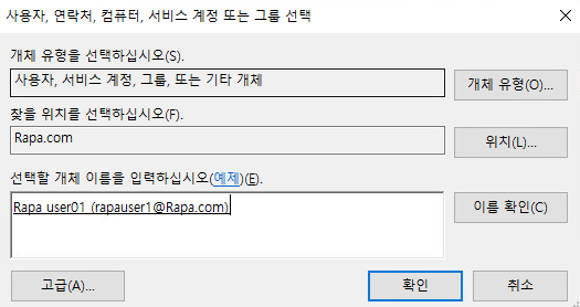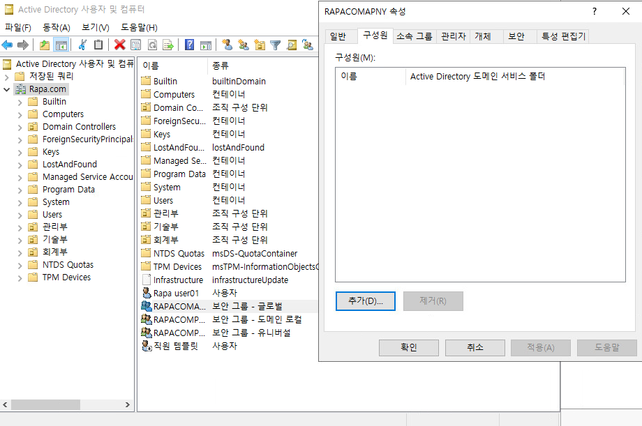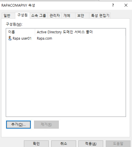 글로벌 도메인 그룹 더블클릭 - 구성원 - 추가 - 개체 이름칸에 rapauser01 적고 확인 - 확인