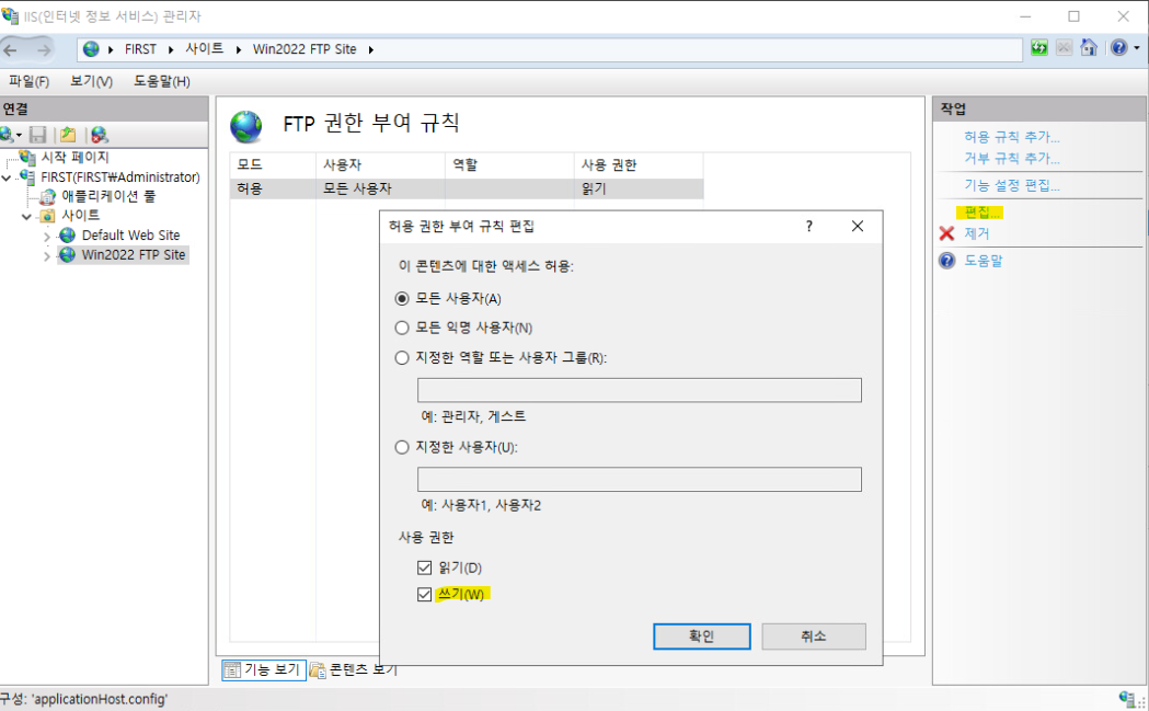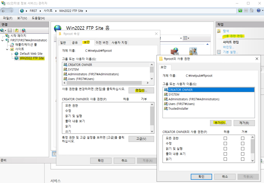 Win2022 FTP Site - 사용 권한 편집 - 보안 - 편집 - 추가