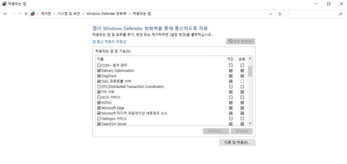 제어판 - 시스템 및 보안 - Windows Defender 방화벽 - Windows Defender 방화벽을 통해 앱 또는 기능 허용